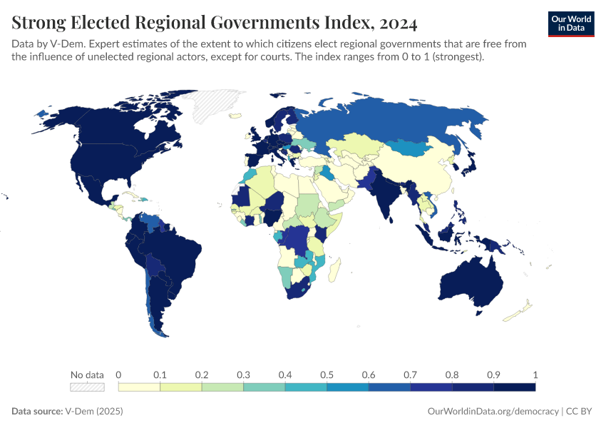 “Data Page: Elected regional governments”, part of the following publication: Bastian Herre, Lucas Rodés-Guirao, and Esteban Ortiz-Ospina (2013) - “Democracy”. Data adapted from V-Dem. Retrieved from https://wip-stagingserver-resources.owid.pages.dev:8789/20260304-094028/grapher/strong-elected-regional-governments-index.html [online resource] (archived on March 4, 2026).How to cite this data