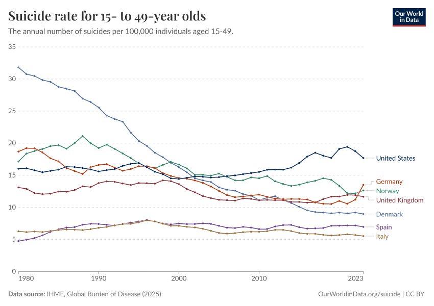 IHME, Global Burden of Disease (2025) – with major processing by Our World in Data. “Suicide rate for 15- to 49-year olds” [dataset]. IHME, Global Burden of Disease, “Global Burden of Disease - Deaths” [original data]. Retrieved March 12, 2026 from https://wip-stagingserver-resources.owid.pages.dev:8789/20260304-094028/grapher/suicide-rate-for-15--to-49-year-olds.html (archived on March 4, 2026).