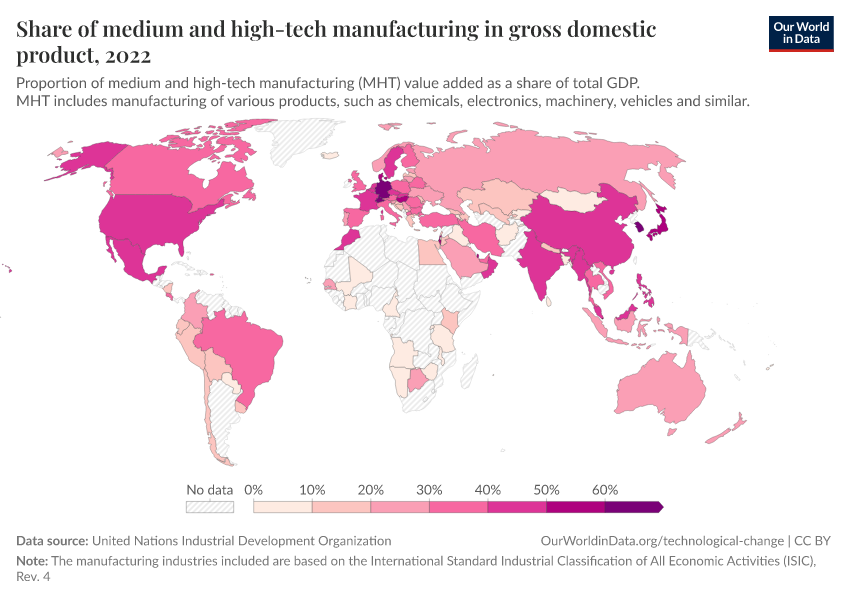 “Data Page: Share of medium and high-tech manufacturing in gross domestic product”. Our World in Data (2026). Data adapted from United Nations Industrial Development Organization. Retrieved from https://wip-stagingserver-resources.owid.pages.dev:8789/20260304-094028/grapher/total-manufacturing-value-added-from-high-tech.html [online resource] (archived on March 4, 2026).How to cite this data