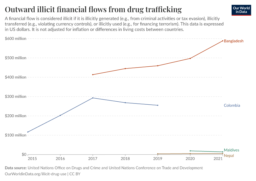 “Data Page: Outward illicit financial flows from drug trafficking”. Our World in Data (2026). Data adapted from United Nations Office on Drugs and Crime and United Nations Conference on Trade and Development. Retrieved from https://wip-stagingserver-resources.owid.pages.dev:8789/20260304-094028/grapher/total-outward-financial-flows-from-drug-trafficking.html [online resource] (archived on March 4, 2026).How to cite this data