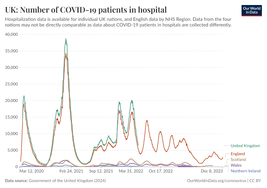 Government of the United Kingdom (2024) – with minor processing by Our World in Data. “UK: Number of COVID-19 patients in hospital” [dataset]. Government of the United Kingdom, “UKHSA data dashboard” [original data]. Retrieved March 12, 2026 from https://wip-stagingserver-resources.owid.pages.dev:8789/20260304-094028/grapher/uk-covid-hospital-patients.html (archived on March 4, 2026).