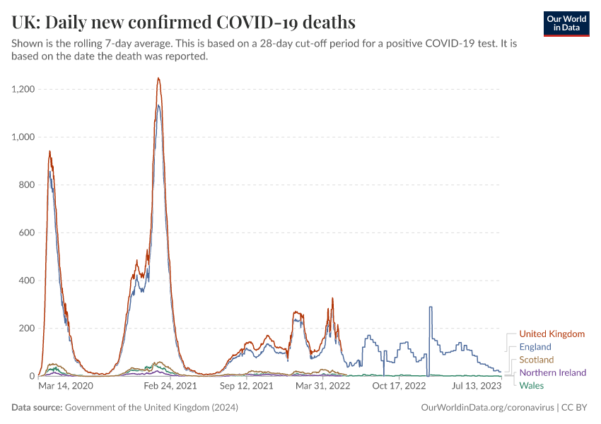Government of the United Kingdom (2024) – with minor processing by Our World in Data. “UK: Daily new confirmed COVID-19 deaths” [dataset]. Government of the United Kingdom, “UKHSA data dashboard” [original data]. Retrieved March 12, 2026 from https://wip-stagingserver-resources.owid.pages.dev:8789/20260304-094028/grapher/uk-daily-covid-deaths.html (archived on March 4, 2026).