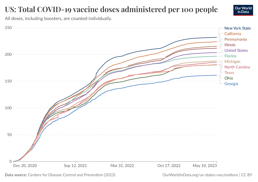 Centers for Disease Control and Prevention (2023) – processed by Our World in Data. “US: Total COVID-19 vaccine doses administered per 100 people” [dataset]. Centers for Disease Control and Prevention, “COVID-19, Vaccinations (United States)” [original data]. Retrieved March 12, 2026 from https://wip-stagingserver-resources.owid.pages.dev:8789/20260304-094028/grapher/us-state-covid-vaccines-per-100.html (archived on March 4, 2026).