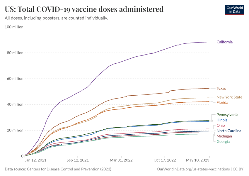 Centers for Disease Control and Prevention (2023) – processed by Our World in Data. “US: Total COVID-19 vaccine doses administered” [dataset]. Centers for Disease Control and Prevention, “COVID-19, Vaccinations (United States)” [original data]. Retrieved March 12, 2026 from https://wip-stagingserver-resources.owid.pages.dev:8789/20260304-094028/grapher/us-total-covid-19-vaccine-doses-administered.html (archived on March 4, 2026).