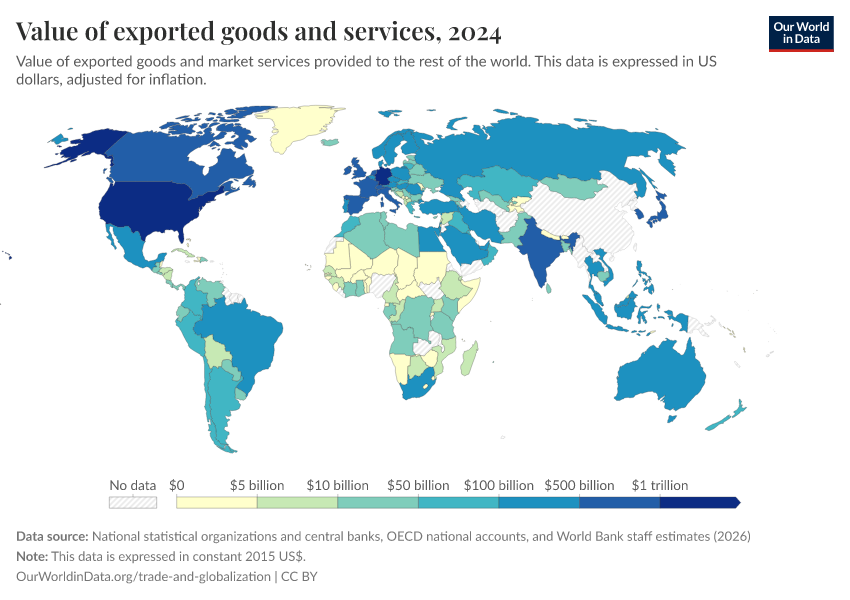 “Data Page: Value of exported goods and services”. Our World in Data (2026). Data adapted from National statistical organizations and central banks, OECD national accounts, and World Bank staff estimates. Retrieved from https://wip-stagingserver-resources.owid.pages.dev:8789/20260304-094028/grapher/value-of-exported-goods-and-services.html [online resource] (archived on March 4, 2026).How to cite this data