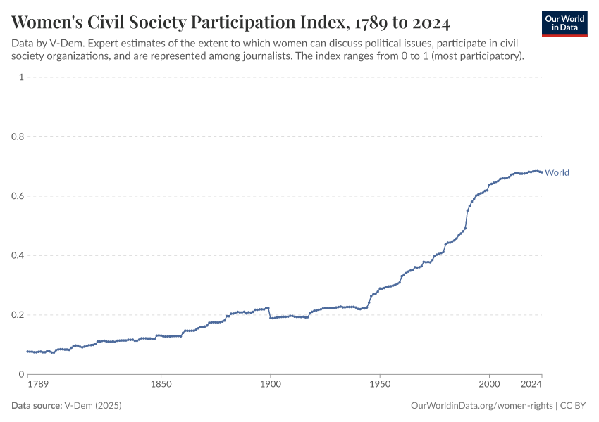 “Data Page: Women's civil society participation index”, part of the following publication: Bastian Herre, Lucas Rodés-Guirao, and Esteban Ortiz-Ospina (2013) - “Democracy”. Data adapted from V-Dem. Retrieved from https://wip-stagingserver-resources.owid.pages.dev:8789/20260304-094028/grapher/women-civil-society-participation-index.html [online resource] (archived on March 4, 2026).How to cite this data