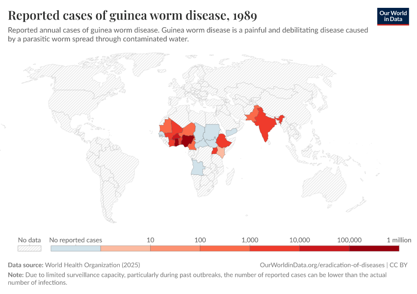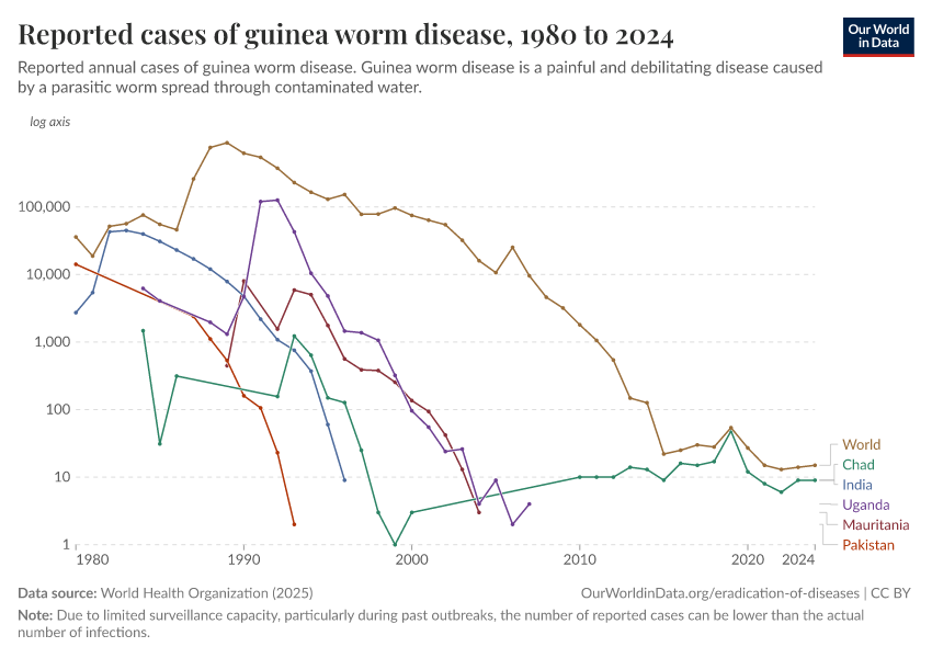 Saloni Dattani and Fiona Spooner (2022) - “Guinea worm disease is close to being eradicated – how was this progress achieved?” Published online at OurWorldinData.org. Retrieved from: 'https://wip-stagingserver-resources.owid.pages.dev:8789/20260304-094028/guinea-worm-path-eradication.html' [Online Resource] (archived on March 4, 2026).BibTeX citation