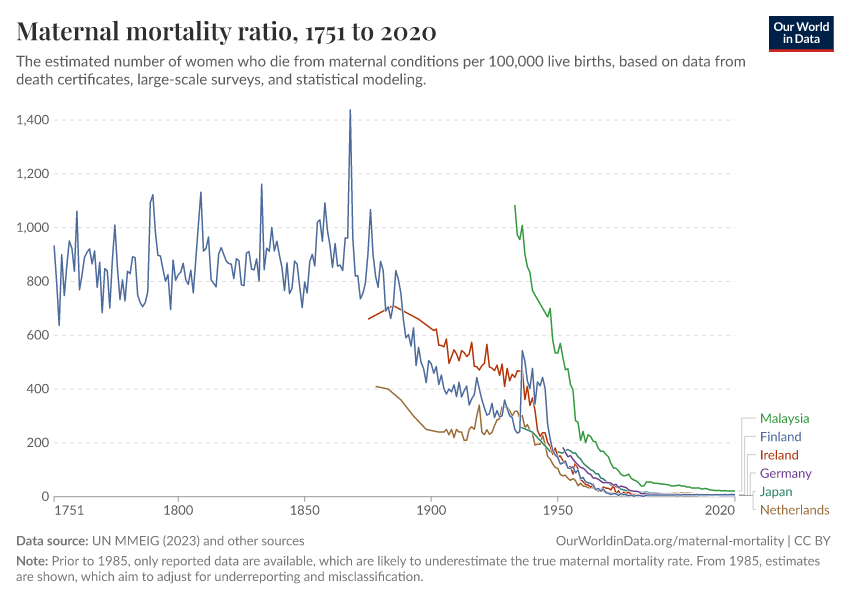 Historical data on maternal mortality, particularly from high-income countries, shows significant reductions over time.