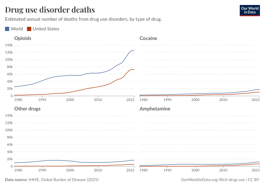 Hannah Ritchie, Pablo Arriagada, and Max Roser (2022) - “Opioids, Cocaine, Cannabis, and Other Illicit Drugs” Published online at OurWorldinData.org. Retrieved from: 'https://wip-stagingserver-resources.owid.pages.dev/illicit-drug-use' [Online Resource]BibTeX citation
