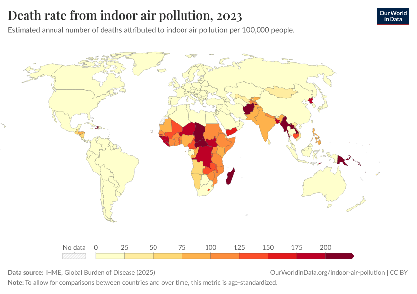 This is based on the share of deaths that are attributable to indoor air pollution based on the impact of air pollution on the risk of diseases like cardiovascular disease, lung disease, lung cancer, and others. In other words, it is an estimate of the share of all deaths that would be prevented if indoor air pollution was absent.