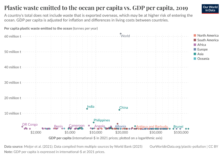 People often find this global distribution surprising. Since consumers in rich countries tend to use a lot more plastic people expect that they contribute a lot more to plastic pollution than they actually do. And it’s not just about population size: even on a per capita basis, rich countries contribute very little plastic to the ocean. European countries, for example, emit less than 0.1 kilograms of plastic per person. This compares to 3.5 kilograms in the Philippines or 2.4 kilograms in Malaysia.