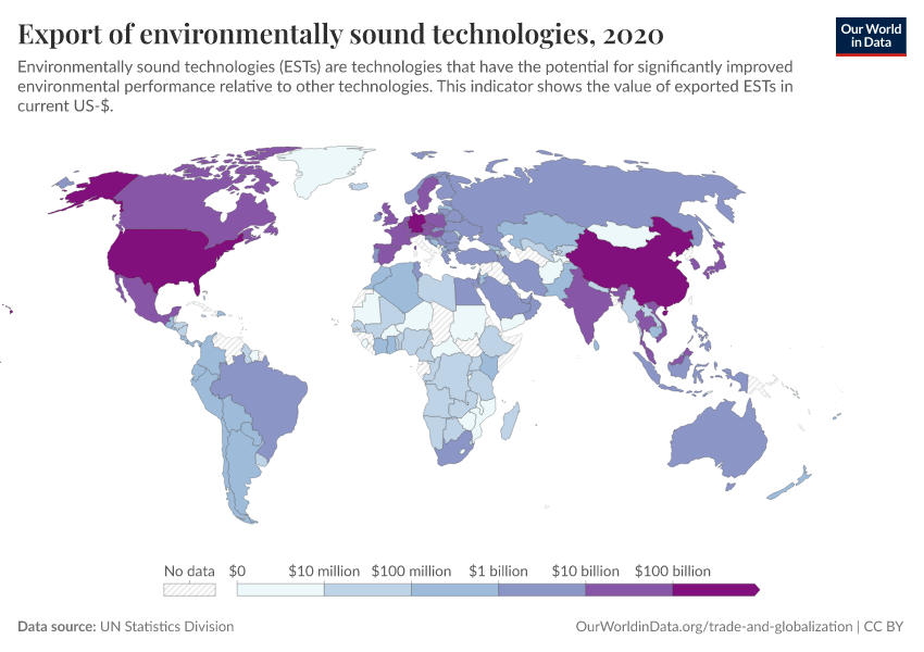 This indicator is measured in terms of the total trade of tracked ESTs, which includes exports, imports, and re-exports and re-imports, as well as national investment in ESTs. Data on exports and imports of ESTs is shown in the interactive visualization.