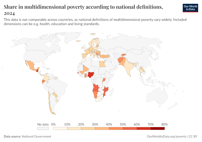 Related data: Data on multidimensional poverty, measured as the Multidimensional Poverty Index (MPI), can be found in this chart. This data has much better coverage across countries and time and is measured consistently, making it comparable between countries.