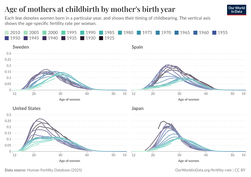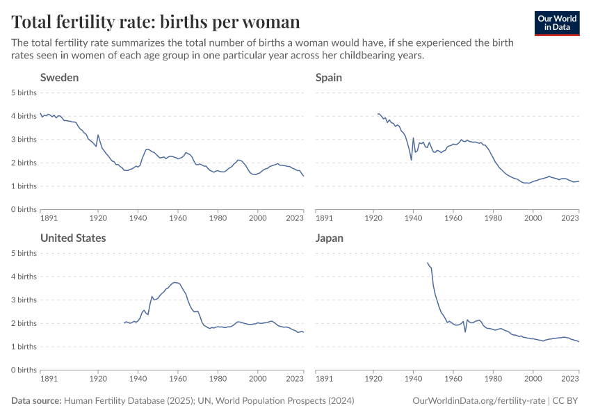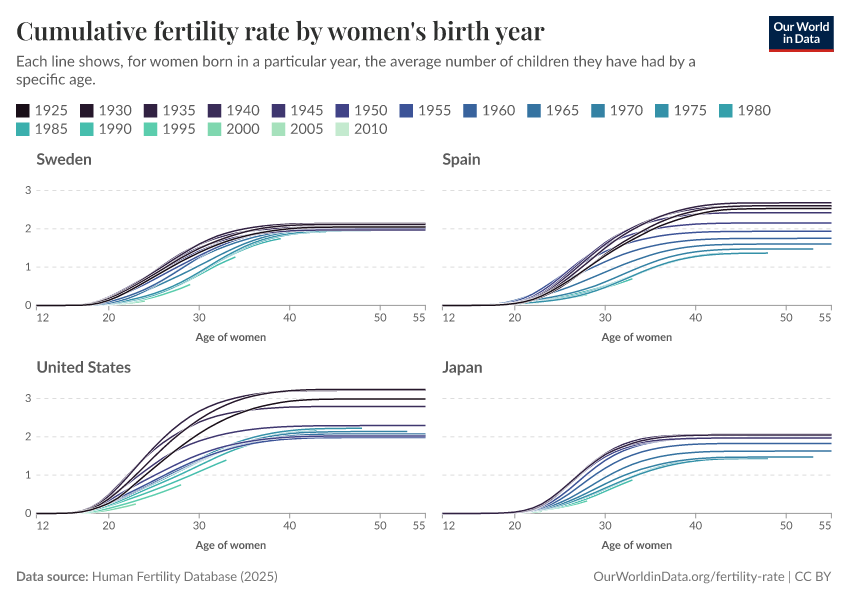 Saloni Dattani and Lucas Rodés-Guirao (2025) - “Why the total fertility rate doesn’t necessarily tell us the number of births women eventually have” Published online at OurWorldinData.org. Retrieved from: 'https://wip-stagingserver-resources.owid.pages.dev:8789/20260304-094028/total-fertility-rate-births-per-woman.html' [Online Resource] (archived on March 4, 2026).BibTeX citation