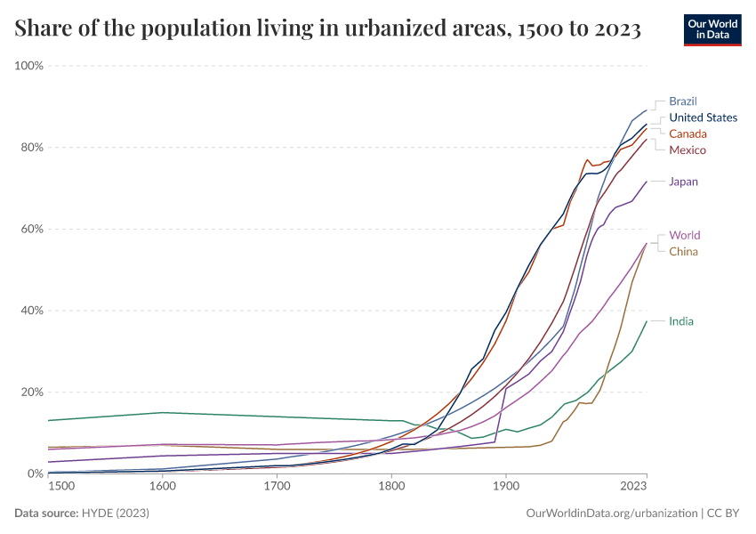 In the map below we see how the share of populations living in urban areas has changed in recent centuries. Data on urbanization dating back to 1500 is available only for select countries, with an estimated share at the global level. Using the timeline on the map (or by clicking on a country) you can see how this share has changed over time.