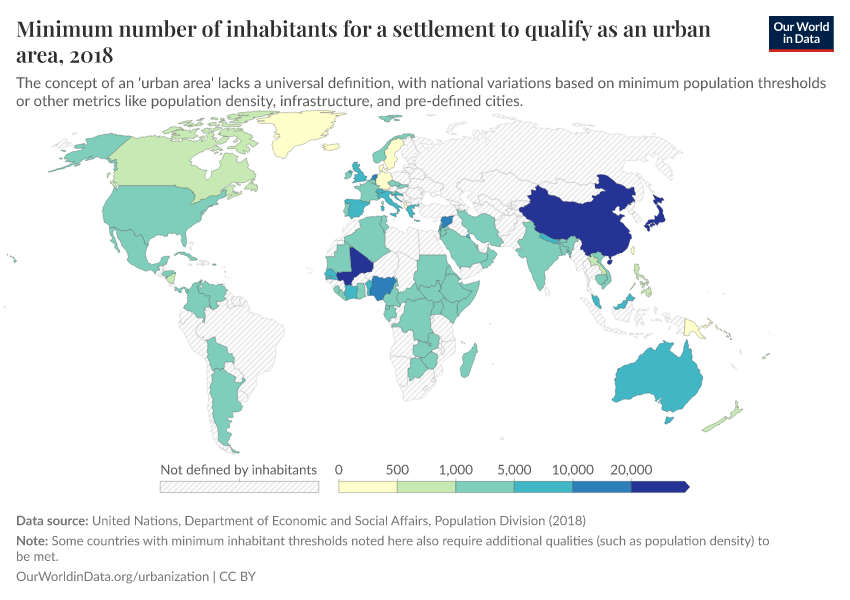 There is currently no universal definition of what 'urban' means. The UN reports figures based on nationally defined urban shares. The problem, however, is that countries adopt very different definitions of urbanization. Not only do the thresholds of urban versus rural vary, but the types of metrics used also differ. Some countries use minimum population thresholds, others use population density, infrastructure development, employment type, or simply the population of pre-defined cities.