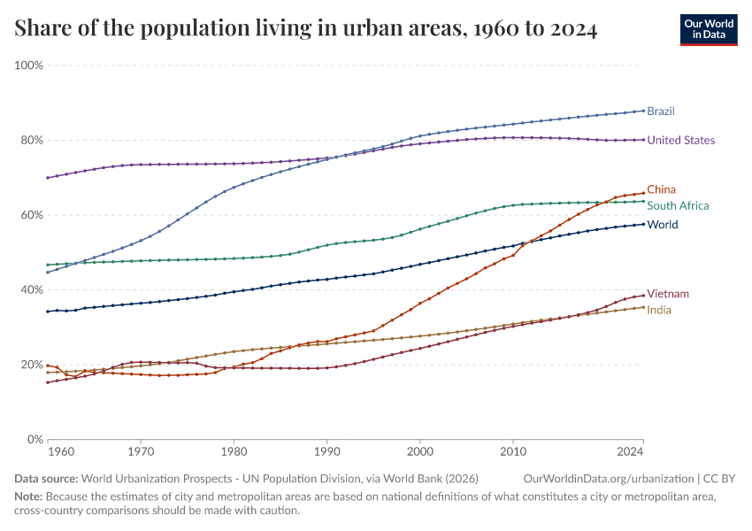 Hannah Ritchie, Veronika Samborska, and Max Roser (2024) - “Urbanization” Published online at OurWorldinData.org. Retrieved from: 'https://wip-stagingserver-resources.owid.pages.dev/urbanization' [Online Resource]BibTeX citation